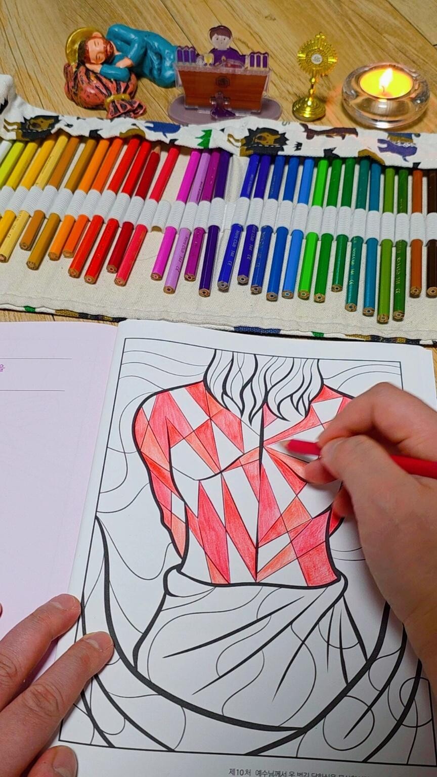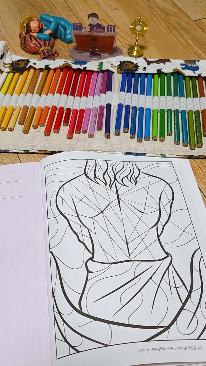 우연히 인스타로 책 나왔다는 소식을 전하고 부랴부랴 서평이벤에 당첨되어 책을 받아보게 되었네요. 똥손인 내가 할 수 있을까.... ㅠㅠ 색채이론이며, 색칠하는 방법이며, 명암대비 이런거 하나도 모르는 내가 할 수 있을까.... 하는 마음도 잠시.... 신부님의 가이드도 있고 시작기도도 바치면서 한칸 한칸 정말 묵상글을 읽어보며 색칠하는데 제 색연필의 사각사각 소리와 저만의 묵상도 함께 하며 칠하다 보니 어렵지 않았고 성당의 스테인드 글라스를 생각하며 칠하니 재미도 있었습니다. 그야말로 저만의 십자가의 길 스테인드 글라스가 되는것 같아서요 ㅎㅎ 책 되게 얇고 종이질은 최고입니다. 사진은 명암대비 따위 없는 똥손의 작품(?) 입니다 ㅎㅎ 되게 좋아요. 마니마니 사세요 ㅎㅎ 스벅 커피 두잔 포기하면 충분히 삽니다 ㅎㅎㅎ 최고!