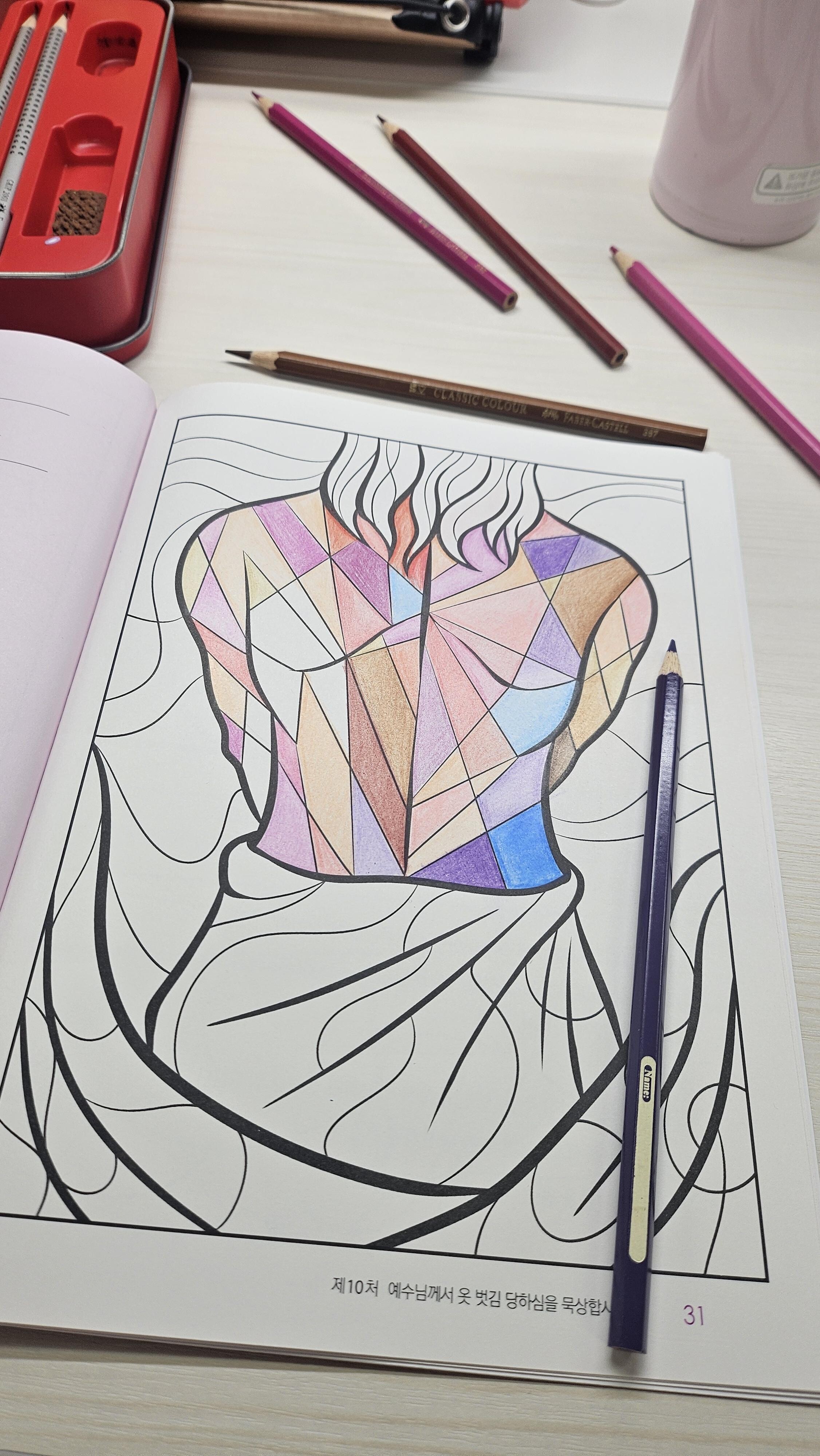 작가의 말처럼 이 책은 신부님이 부제님일 때 십자가의 길 묵상을 위해 적은 글과 직접 그린 그림으로 채워져있었다. 시작기도 후 각 처마다 묵상이 있고 그에 대한 그림이 마치 모자이크처럼 쪼개어 그려져있어 칸에 맞게 색을 칠하게 되어있다.