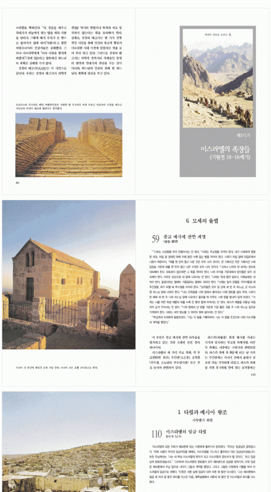 이탈리아의 한 출판사가 구약성서, 복음서, `사도행전에서 요한묵시록까지` 등 3권으로 출간한 <한눈에 보는 성서여행>(생활성서사 펴냄)은 성서의 원본에 더 충실하다.<온 가족이 ...>가 세계적 명화들을 통해 통찰을 도왔다면, 이 책은 예루살렘 등 현지 사진을 사용해 당시 상황을 이해하게 했다. 이 책은 기자들로 분류하거나 연대기적으로 분류하지 않고, 당시 상황 속에서 이야기를 전개했다. 가령 `예수님의 복음`을 `세례자 요한과 예수님의 공생활 시작`,`수난과 부활`등 상황별로 나눠 성서의 구절을 제시한뒤 그 내용을 해설했다. 조연현 / 한겨레 신문 / 2002-01-05 말씀·사진·지도·풀이가 한눈에 `쏙`
