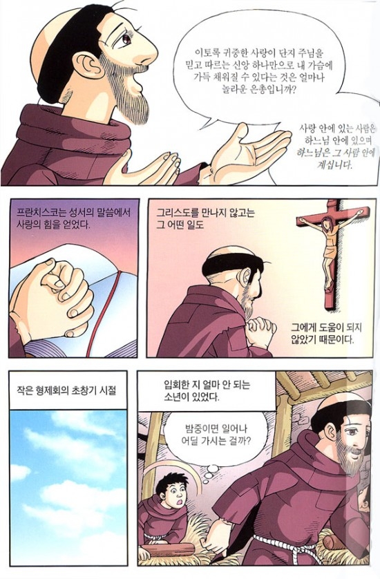 가톨릭역사에서 가장 많은 사랑을 받아 온 성인 프란치스코의 생애과 프란치스칸 영성을 만화로 구성한 어린이를 위한 성인전