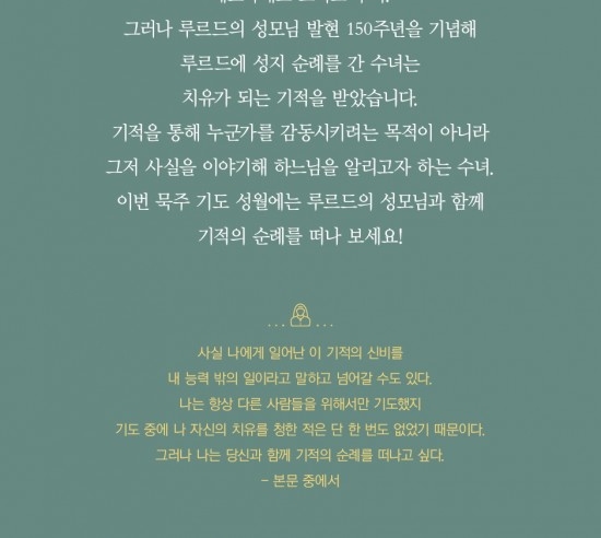 그러나 기적은 존재한다. 가톨릭출판사에서는 모든 고통 속에서 희망을 잃어버린 이들에게 하느님의 선물인 ‘기적’이 현실에 존재함을 보여 주는 책, 《기적은 존재한다》를 펴냈다. 이 책은 40여 년간 육체적 고통, 그 고통에 수반되는 정신적 고통 속에서 살아온 베르나데트 모리오 수녀가 루르드에 순례를 다녀와서 기적적으로 치유된 이야기, 치유된 사례가 공식적으로 기적임을 인정받은 후 달라진 삶까지 모든 것을 담았다. 모리오 수녀는 고통받는 다른 이들이 희망을 가질 수 있도록 자신이 직접 기적을 겪은 사실을 이야기한다.