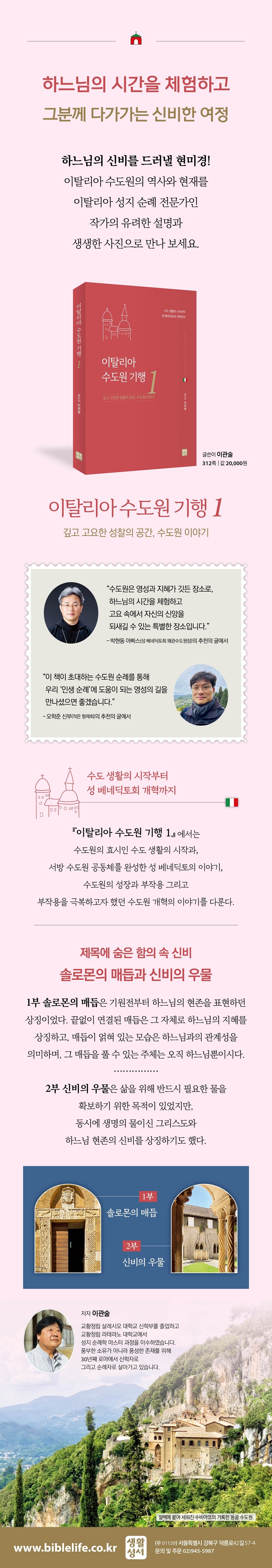 하느님의 신비를 드러낼 현미경 같은 역할을 한 이탈리아 수도원의 역사와 현재를 이탈리아 성지 순례 가이드인 작가의 유려한 설명과 생생한 사진으로 전달해 주는 책. 1권에서는 수도 생활의 역사와 성 베네딕토회의 등장과 성장, 수도회의 세속화에 저항한 개혁 수도회들의 등장을 다룬다.