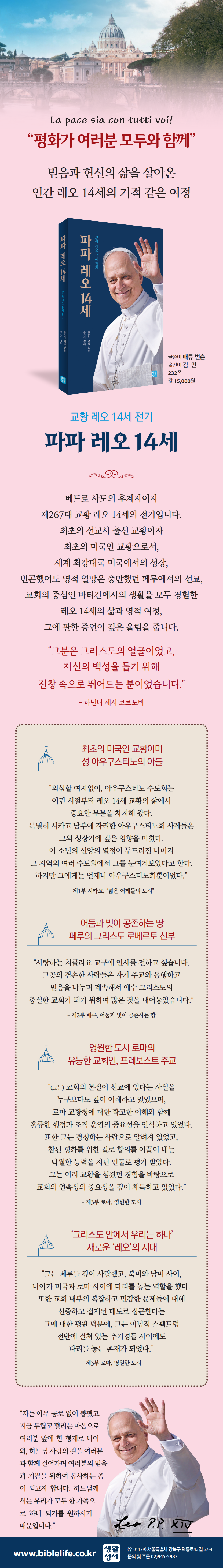 제267대 교황으로서 사도 베드로의 후계자가 된 레오 14세의 삶을 감동적으로 그려낸 전기이다. 물질문명의 중심 미국과 영적 갈망이 깊은 페루, 그리고 바티칸을 아우른 그의 여정이 깊은 울림을 준다. 저자는 엄청난 정보력과 독보적인 접근성, 탁월한 통찰력으로 새로운 교황의 비전과 시대적 사명을 정교하게 조명하면서, 한 인물의 이야기 너머, 교회와 세계가 나아갈 길에 대한 통찰을 전한다.